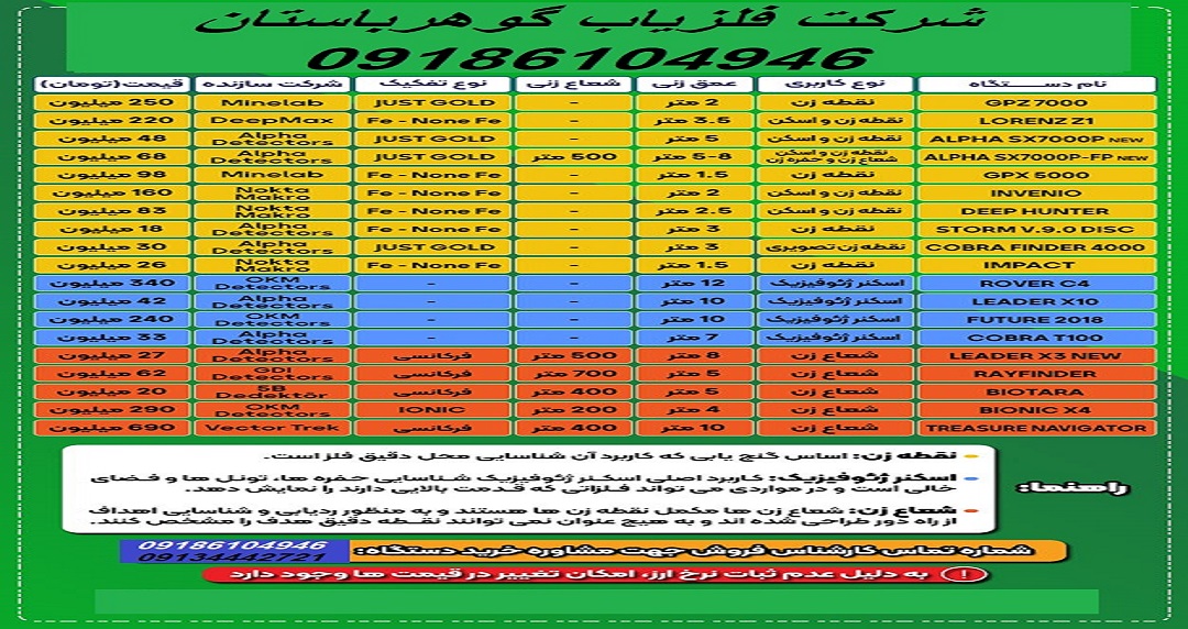 در لیست زیر برای کاهش سردرگمی و انتخاب راحت تر کاربران عزیز تمامی دستگاه های فلزیاب، طلایاب و گنج یاب با تفکیک رنگ مشخص شده است